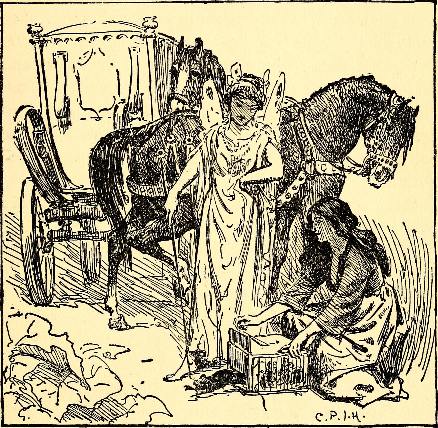 She then went to look into her mouse-trap, where she found six mice, all alive, and ordered Cinderella to lift up a little the trapdoor, when, giving each mouse, as it went out, a little tap with her wand, the mouse was that moment turned into a fine horse, which altogether made a very fine set of six horses of a beautiful mouse-colored dapple-gray. Being at a loss for a coachman,