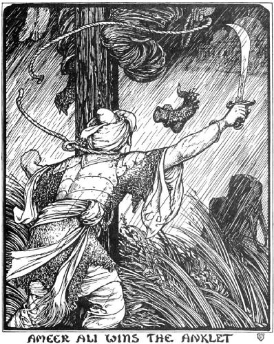 But Ameer Ali gave a sweep upwards with his sharp sword to cut the rope that she had slipped round his neck, and not only cut the cord but cut also the old woman's foot as it dangled above him; and with a yell of pain and anger she vanished into the darkness.