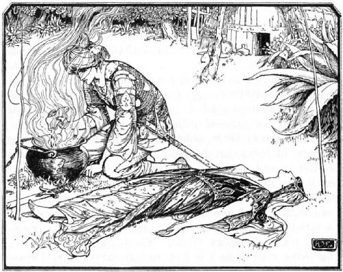 "What is the matter?" she asked, in a voice so soft that he listened like one struck dumb, and she had to repeat the question before he could answer. Then he told her his story, and she went within the cottage and came back with two wands, and a pot of boiling water. The two wands she planted in the ground about six feet apart, and then, turning to him, she said: