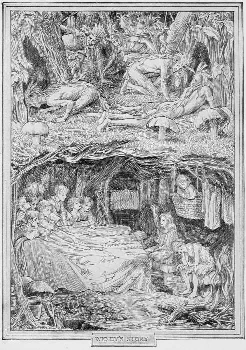Then having given the necessary instructions to the redskins he returned to the home, where an unworthy scene had been enacted in his absence. Panic-stricken at the thought of losing Wendy the lost boys had advanced upon her threateningly.